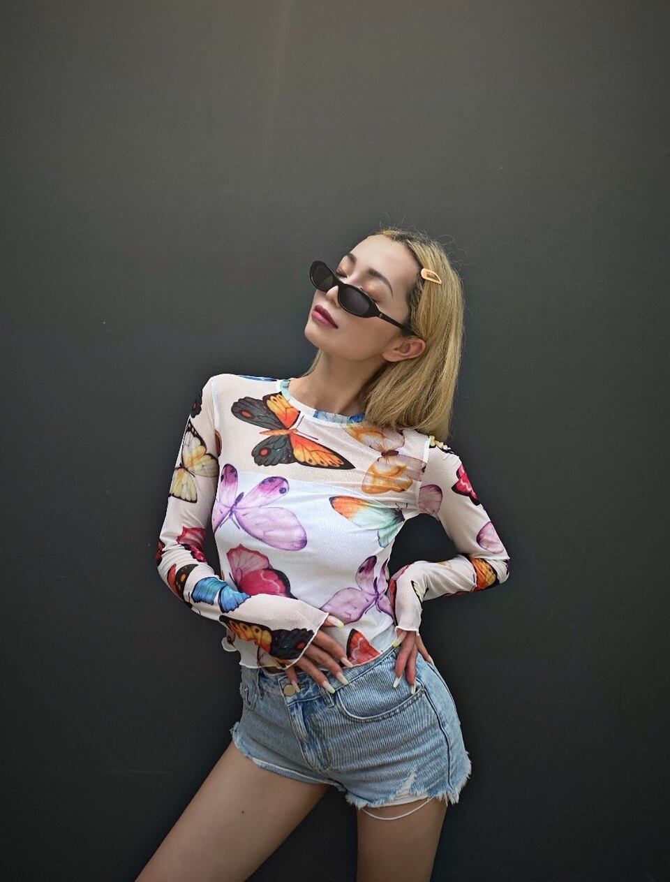 ❤︎トレンド蝶々プリント レースタイトトップス❤︎